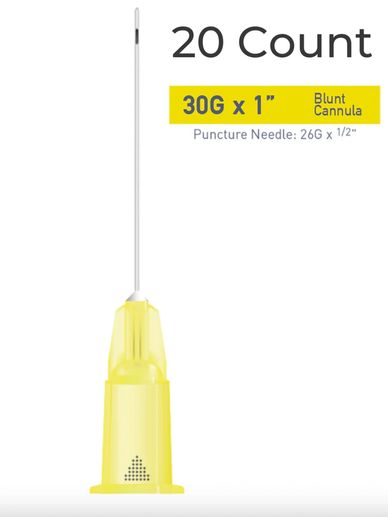 Single cannula of 30G x 1" (25mm). Blunt, flexible microcannula for atraumatic injections.