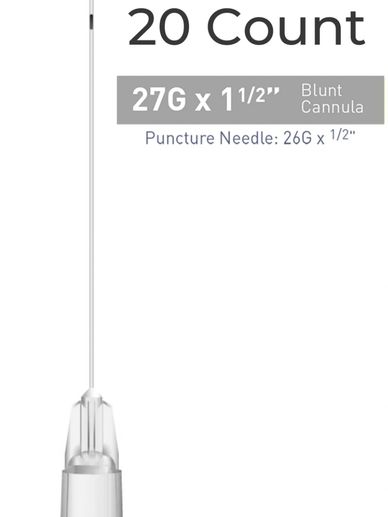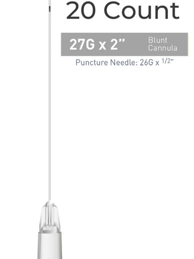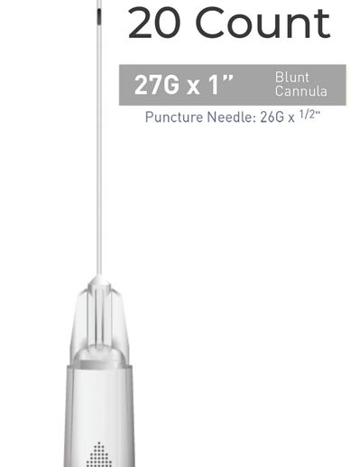 Single Cannula of 27G x 1" (25mm). Blunt, flexible microcannula for atraumatic injections.