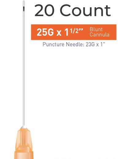 Single Cannula of 25G x 1½" (38mm). Blunt, flexible microcannula for atraumatic injections.
