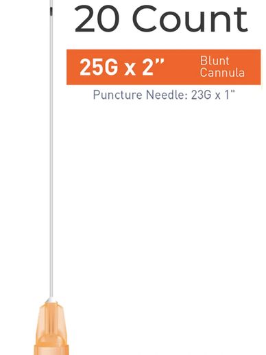 Single Cannula of 25G x 2" (50mm). Blunt, flexible microcannula for atraumatic injections