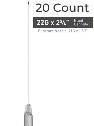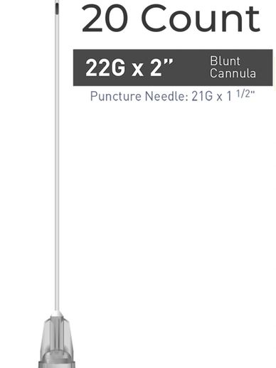 Single Cannula of 22G x 2" (50mm). Blunt, flexible microcannula for atraumatic injections.
