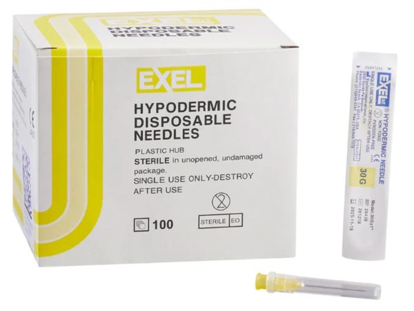 Includes (100) 30G x 1" needles. Hub Color: Yellow