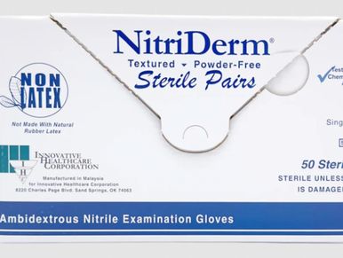 Each box includes 50 sterile pairs of ambidextrous nitrile exam gloves. Nitrile synthetic contains no natural rubber latex proteins. Soft, highly elastic formulation provides the maximum in comfort. Pair packaged in ozone resistant multi-vac packaging.
